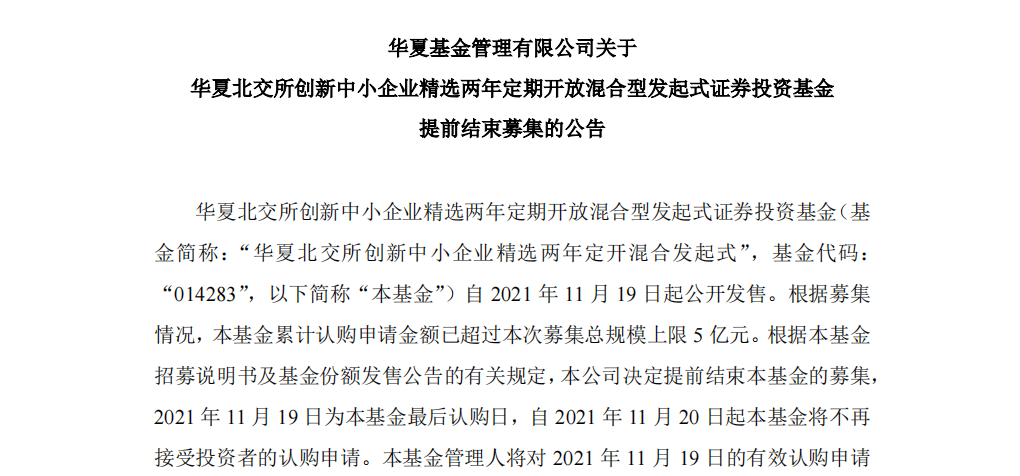 今日收盤后,華夏、南方、廣發(fā)這三家基金公司率先發(fā)布旗下北交所主題基金提前結(jié)束募集的公告。