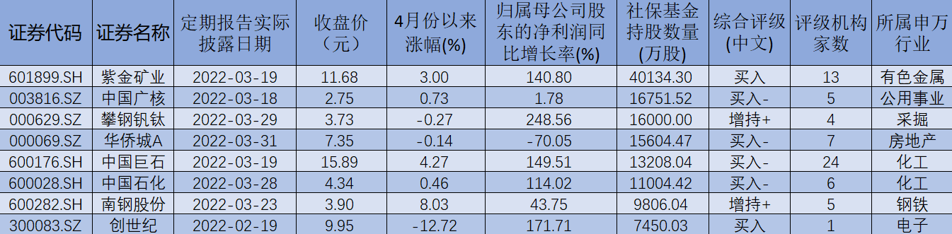 從持股變動情況來看,截至2021年年底,社?;鹦逻M和增持87只個股。其中,新進持有45只個股共計4.46億股;42只個股進行增倉操作。經(jīng)過新進增持后,紫金礦業(yè)暫時居社?;鹬貍}股首位。截至去年年底,社?;鸪止蓴?shù)量達40134.30萬股。中國廣核、攀鋼釩鈦、華僑城A、南山鋁業(yè)、中國巨石、常熟銀行、中國石化等公司的社保基金持股數(shù)量均超1億股。