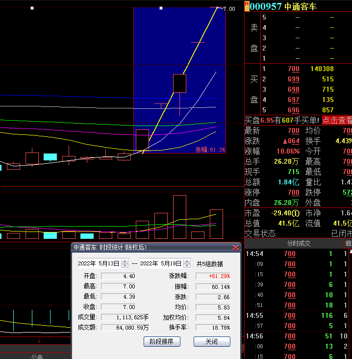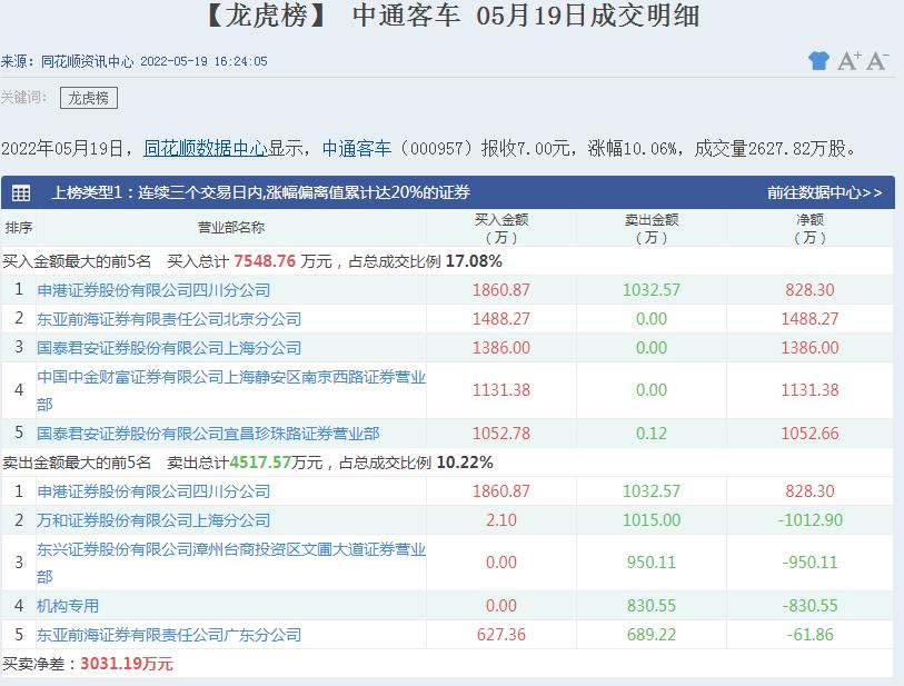 5月19日,中通客車再度漲停,截至收盤,報7.00元,連續(xù)5日漲停,期間累計漲達(dá)61.29%。