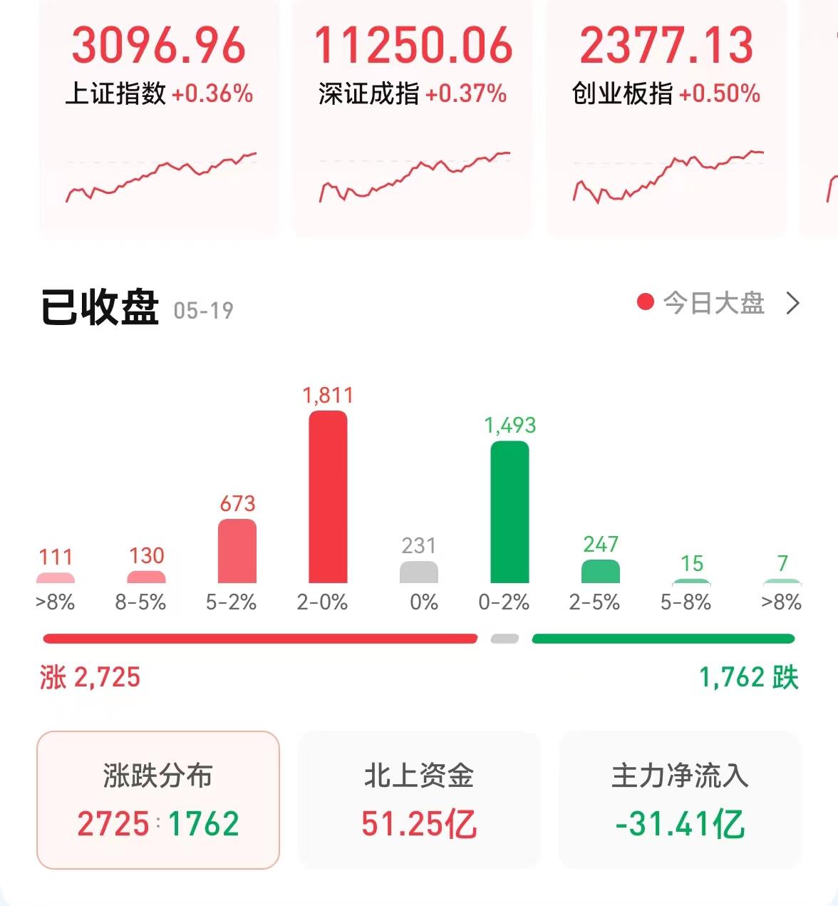 5月19日,三大股指低開高走,集體飄紅,截至收盤,上證指數(shù)漲0.36%報3096.96點(diǎn),深證成指漲0.37%報11250.06點(diǎn),創(chuàng)業(yè)板指漲0.5%報2377.13點(diǎn);兩市合計成交8067.1億元,北向資金凈買入51.25億元??傮w來看,兩市個股漲多跌少。