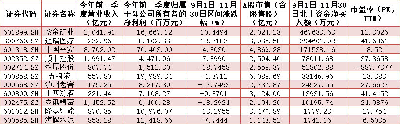 此次未對富時中國A50指數(shù)做出調整,說明成份股整體運行平穩(wěn),北上資金自上次調整后,也加倉了部分成份股。通過梳理同花順陸股通每日十大成交活躍股發(fā)現(xiàn),9月1日至11月30日,11只個股獲北上資金加倉,合計凈買入額124.99億元。其中,紫金礦業(yè)、邁瑞醫(yī)藥。中國平安資金凈買入額分別為46.76億元、39.46億元和17.15億元;另有順豐控股、牧原股份、五糧液等6只個股凈買入額超1億元。