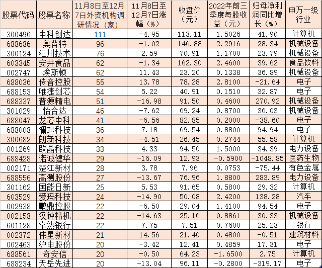 表:11月8日至12月7日受到20家及以上外資調(diào)研的A股上市公司