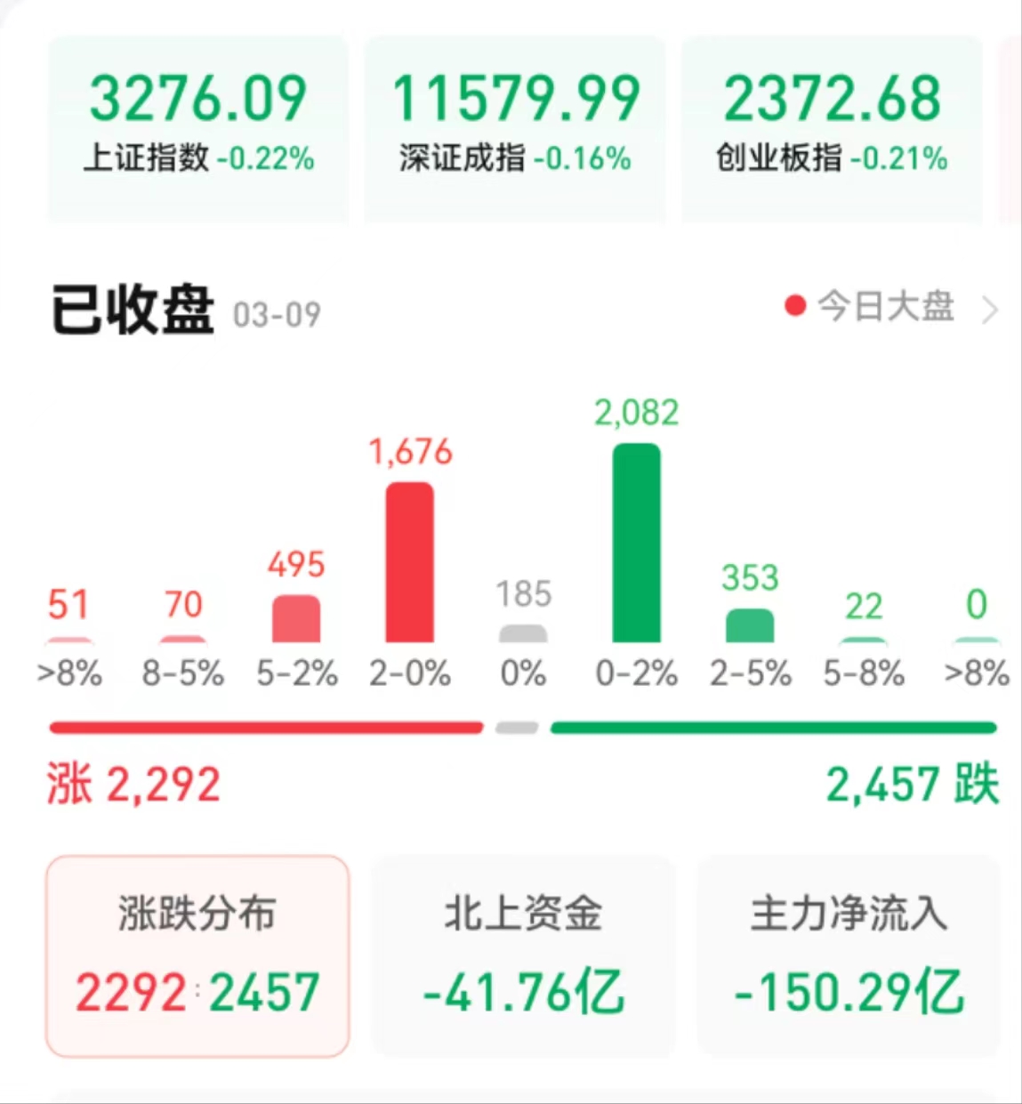 周四(3月9日),A股三大指數(shù)震蕩整理。截至收盤,上證指數(shù)跌0.22%報3276.09點,深證成指跌0.16%報11579.99點,創(chuàng)業(yè)板指跌0.21%報2372.68點;兩市合計成交7566億元,北向資金凈賣出41.76億元??傮w上看,兩市個股跌多漲少。其中,漲停個股達35只,跌停2只。