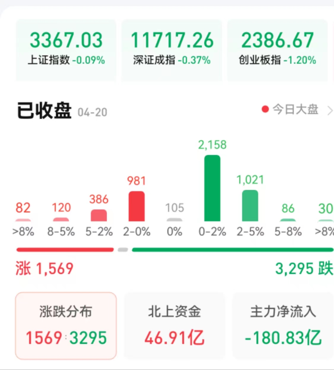 周四(4月20日),A股三大股指繼續(xù)震蕩整理。截至收盤(pán),上證指數(shù)跌0.09%報(bào)3367.03點(diǎn),深證成指跌0.37%報(bào)11717.26點(diǎn),創(chuàng)業(yè)板指跌1.20%報(bào)2386.67點(diǎn),滬深兩市合計(jì)成交額11386.85億元,連續(xù)第13個(gè)交易日突破萬(wàn)億元,北向資金凈買(mǎi)入46.91億元。總體上看,兩市個(gè)股跌多漲少。其中,漲停個(gè)股達(dá)36只,跌停個(gè)股達(dá)25只。