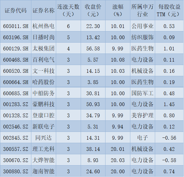 表:連續(xù)上漲3日且今日收盤漲停股一覽
