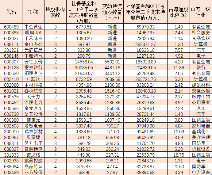 值得關(guān)注的是,今年二季度,有76家A股上市公司的前十大流通股股東中同時出現(xiàn)社?;鸺癚FII身影,合計持股市值達561.26億元。其中,26家公司今年二季度獲社?;鸷蚎FII等長線資金集體加倉,峨眉山A、光庭信息、中金黃金、千禾味業(yè)、金山辦公、中船特氣等6家公司期間獲社?;鸷蚎FII集體增持。此外,有20家公司期間獲社?;鸷蚎FII繼續(xù)加倉,包括云鋁股份、常熟銀行、銅陵有色、廣聯(lián)達、中材科技、春秋航空、天士力、涪陵電力等在內(nèi)的11家公司期間社?;鸷蚎FII累計增持數(shù)量均超1000萬股。