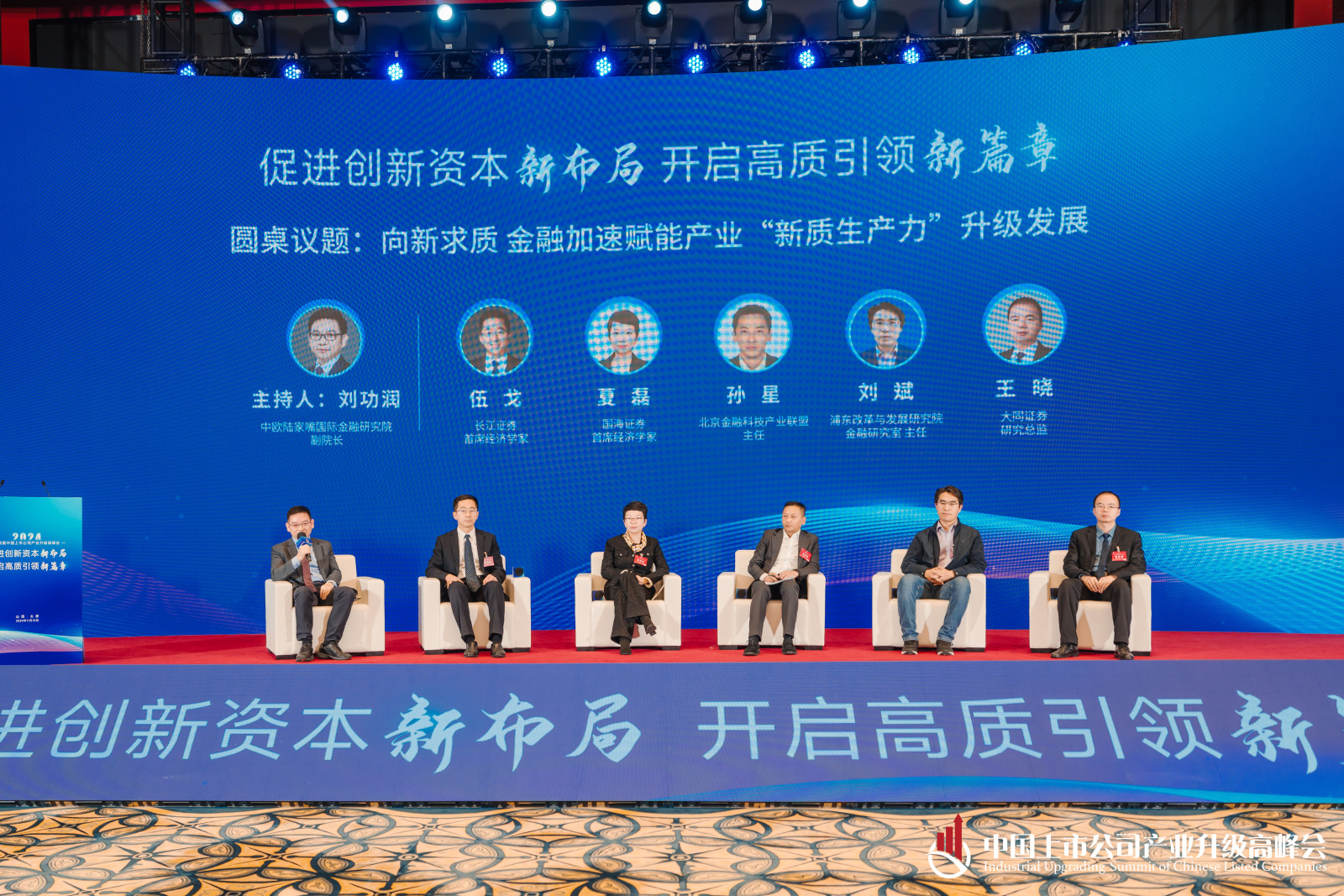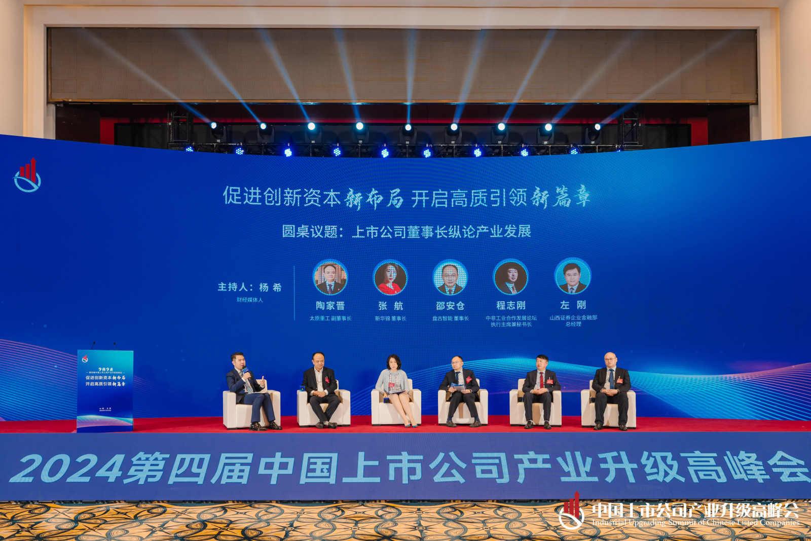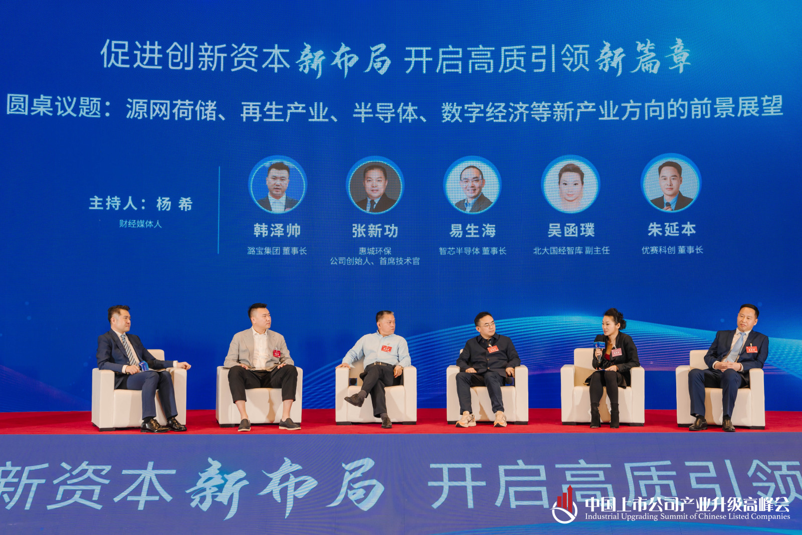 本場(chǎng)論壇的主題是新質(zhì)生產(chǎn)力發(fā)展論壇,探討一下源網(wǎng)荷儲(chǔ)、再生產(chǎn)業(yè)、半導(dǎo)體、數(shù)字經(jīng)濟(jì)等新產(chǎn)業(yè)的方向。首先有請(qǐng)參與本場(chǎng)論壇的各位對(duì)話嘉賓,他們分別是:潞寶集團(tuán)董事長(zhǎng)韓澤帥;惠城環(huán)保董事長(zhǎng)張新功;智芯半導(dǎo)體董事長(zhǎng)易生海;國(guó)經(jīng)智庫副主任吳函璞;優(yōu)賽科創(chuàng)董事長(zhǎng)朱延本。