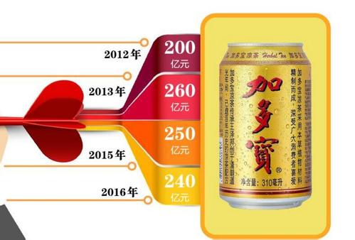 據(jù)媒體此前報(bào)道,2015年加多寶的銷(xiāo)售額在250億元左右。另外,加多寶在2017年3月的一次公開(kāi)會(huì)議上表示其2016年的銷(xiāo)售收入是240億元。而內(nèi)部人士透露,加多寶2017年的銷(xiāo)售總收入預(yù)計(jì)在150億元左右。