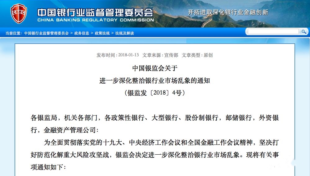 2017年,銀監(jiān)會組織開展了“三三四十”等一系列專項治理行動,下大力氣整治銀行業(yè)市場亂象,取得階段性成效,銀行業(yè)經(jīng)營發(fā)展呈現(xiàn)出積極變化,整體保持穩(wěn)中有進的良好態(tài)勢。但是,整治銀行業(yè)市場亂象具有長期性、復(fù)雜性和艱巨性,是當前及今后一段時期銀行業(yè)改革發(fā)展和監(jiān)管的一項常態(tài)化重點工作。 為全面貫徹落實黨的十九大、中央經(jīng)濟工作會議和全國金融工作會議精神,嚴守不發(fā)生系統(tǒng)性金融風(fēng)險的底線,近日,銀監(jiān)會印發(fā)《關(guān)于進一步深化整治銀行業(yè)市場亂象的通知》,在全國范圍內(nèi)進一步深化整治銀行業(yè)市場亂象,切實鞏固前期專項治理成果,著力引導(dǎo)銀行業(yè)回歸本源、專注主業(yè)、做精專業(yè)、合規(guī)經(jīng)營、穩(wěn)健發(fā)展。