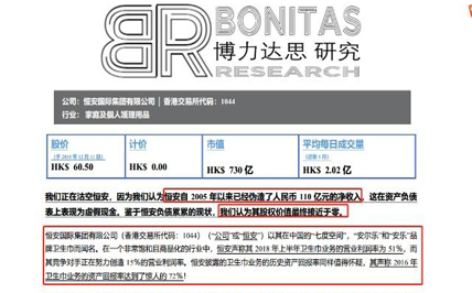 多家媒體報(bào)道稱,北京時(shí)間12月12日,沽空機(jī)構(gòu)BonitasResearch表示,恒安國(guó)際(01044,HK)財(cái)報(bào)中現(xiàn)金項(xiàng)目作假,自2005年以來(lái)虛構(gòu)凈利潤(rùn)達(dá)110億元人民幣,股票價(jià)值接近零。[詳細(xì)]