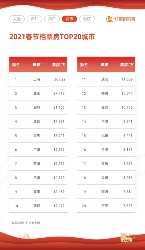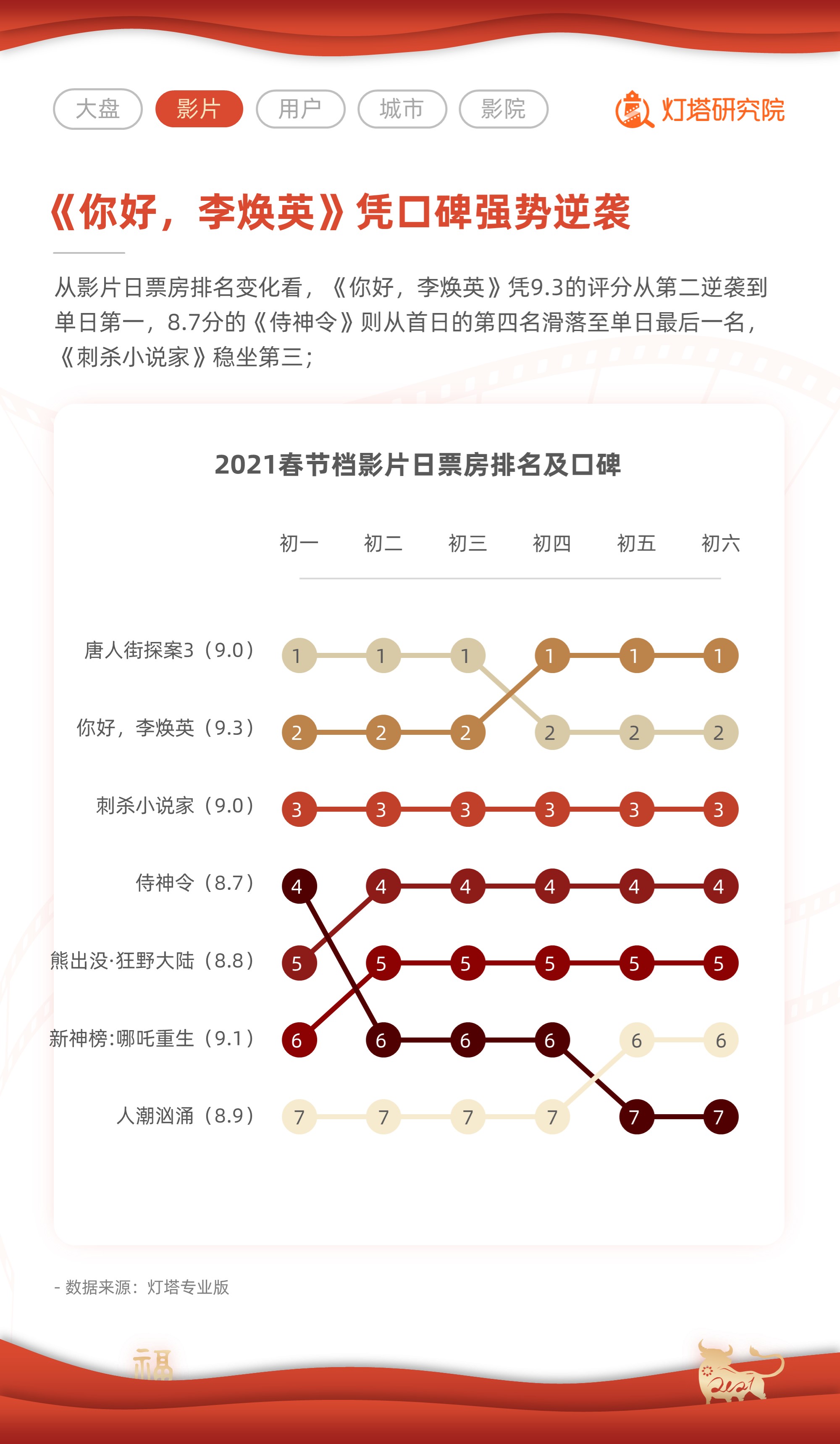 阿里影業(yè)旗下燈塔研究院《2021春節(jié)檔市場數(shù)據(jù)洞察報(bào)告》顯示,除78.22億元總票房成績較2019年大增32.5%創(chuàng)下新紀(jì)錄外,2021春節(jié)檔同時(shí)憑借1.6億總觀影人次再創(chuàng)新紀(jì)錄;票房排名前兩位的影片《唐人街探案3》(35.5億元)、《你好,李煥英》(27.2億元),將八成票房攬入囊中。