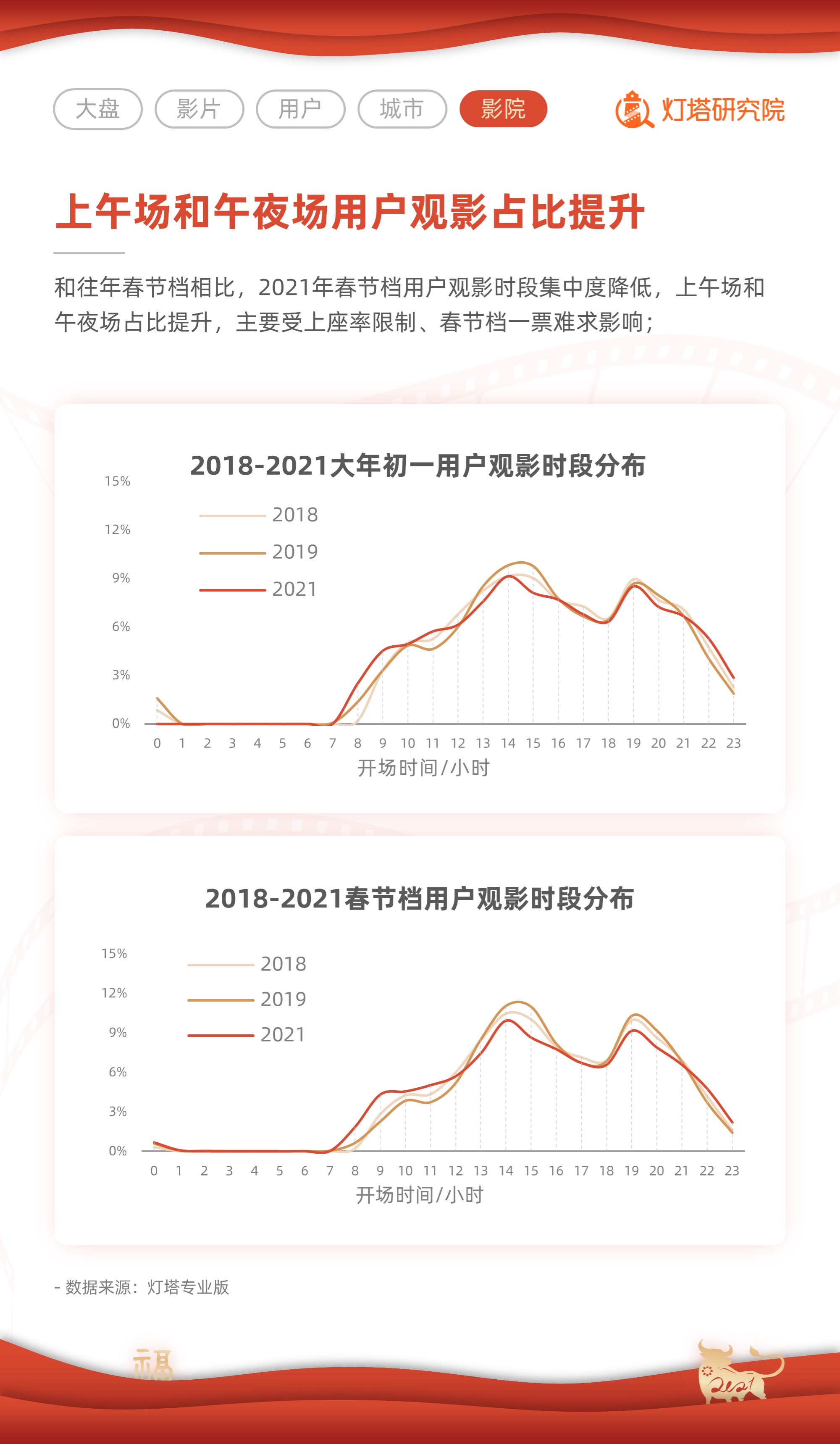 從用戶數(shù)據(jù)來看,本屆春節(jié)檔,80%的用戶僅觀看1部影片;雙人結(jié)伴觀影占比較2019年春節(jié)檔降低7%,單人和多人觀影側(cè)則均有提升。因影院上座率依舊有所限制、春節(jié)檔影片一票難求,用戶觀影時(shí)段集中度較往期春節(jié)檔有明顯降低,14:00-15:00場次依舊是最受歡迎的觀影時(shí)段,與此同時(shí),上午場和夜場觀影占比有所提升。