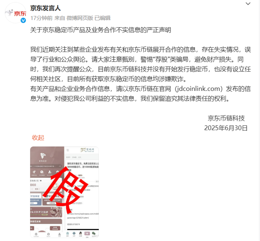 對(duì)此,“京東發(fā)言人”官方微博6月30日發(fā)文表示:“我們近期關(guān)注到某些企業(yè)發(fā)布有關(guān)和京東幣鏈展開合作的信息,存在失實(shí)情況,誤導(dǎo)了行業(yè)和公眾輿論。目前京東幣鏈科技并沒有開始發(fā)行穩(wěn)定幣,也沒有設(shè)立任何相關(guān)社區(qū),目前所有獲取京東穩(wěn)定幣的信息均涉嫌欺詐。”