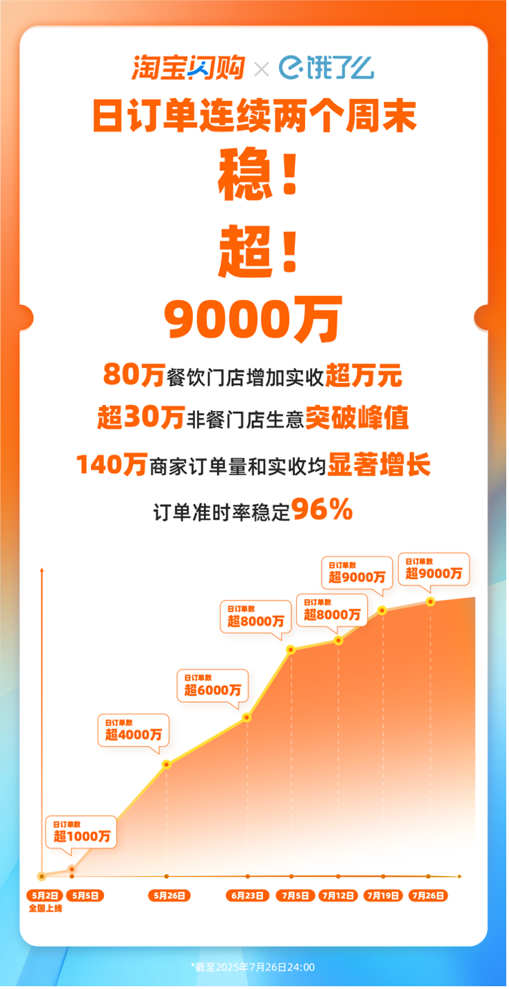 本報(bào)訊 (記者梁傲男)7月28日,淘寶閃購和餓了么聯(lián)合宣布,連續(xù)兩個(gè)周末的日訂單(7月19日及7月26日)超過9000萬(不含0元購及自提)。此前的7月14日,淘寶閃購已宣布日訂單峰值連續(xù)兩周超8000萬,訂單量呈穩(wěn)定且持續(xù)提升突破勢頭。