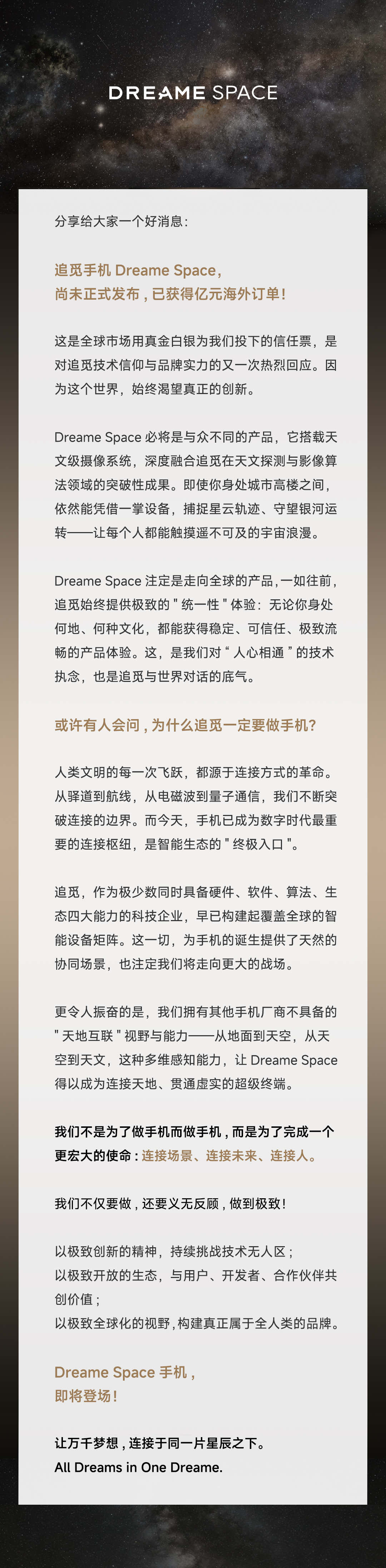 追覓科技正用其行動證明:中國科技企業(yè)不僅能夠做好商業(yè)模式創(chuàng)新,更能夠攻克硬核技術,參與人類最前沿的探索事業(yè)。Dreame Space手機的推出,將天文攝影帶給普通消費者,讓科技真正服務于人類對未知的好奇與探索,體現了科技與人文的完美結合。