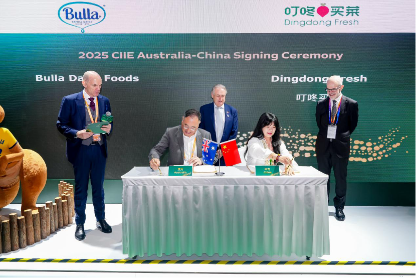 11月6日,叮咚買菜與澳洲知名乳制品品牌Bulla在進(jìn)博會上簽訂了直采協(xié)議,約定將于明年采購至少500萬元的乳制品商品,簽約現(xiàn)場由澳大利亞貿(mào)易和旅游部長、參議員唐方睿見證。