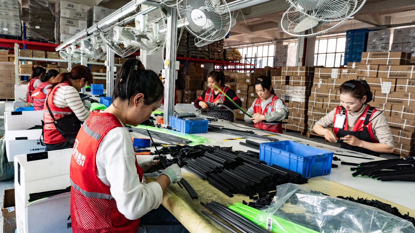工人在生產(chǎn)線上熟練組裝雨刮器零部件 馬琳|攝