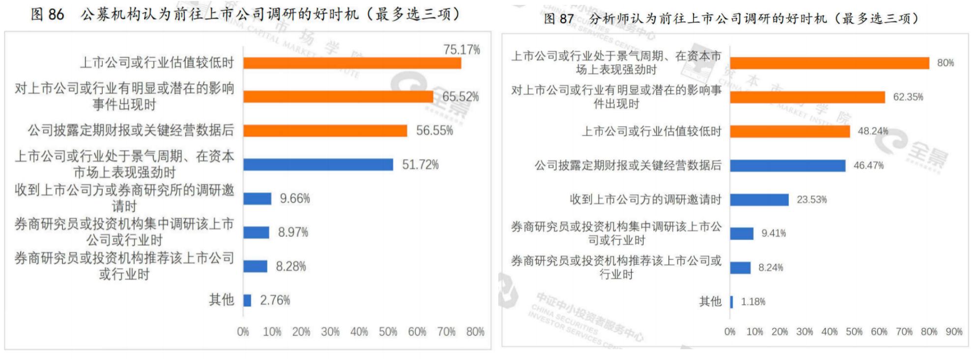一是善用機構投資者和分析師調(diào)研時點的偏好,獲得更多關注。分析師偏好在上市公司或行業(yè)“景氣時”去調(diào)研,公募機構偏好在上市公司或行業(yè)“低谷時”去調(diào)研,而且兩方都偏好在“上市公司或行業(yè)有重大影響事件時”去調(diào)研。