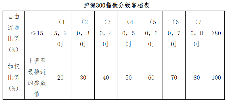 滬深300指數(shù)在確定樣本加權比例時,采用分級靠檔的方法,即根據(jù)證券的自由流通量占樣本總股本的比例(即自由流通比例)賦予總股本一定的加權比例,以確保計算指數(shù)的股本保持相對穩(wěn)定。